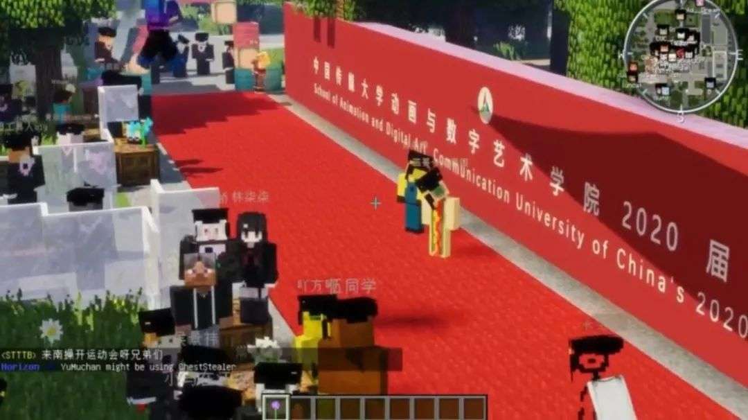 实际上,在这波元宇宙热之前。虚拟演唱会、数字人、云上会议等虚拟模式的产品形态就已经出现。去年疫情期间,中国传媒大学的学生就借助沙盒游戏Minecraft平台,在游戏里搭建了一个像素中国传媒大学校园,并举办了一场云上毕业典礼当天。参与的同学以动画形象进行互动,主持人现场大喊“请不要在红毯中央逗留过久”“请不要互相打架”“请同学不要飞来飞去”,还曾一度引发热议。