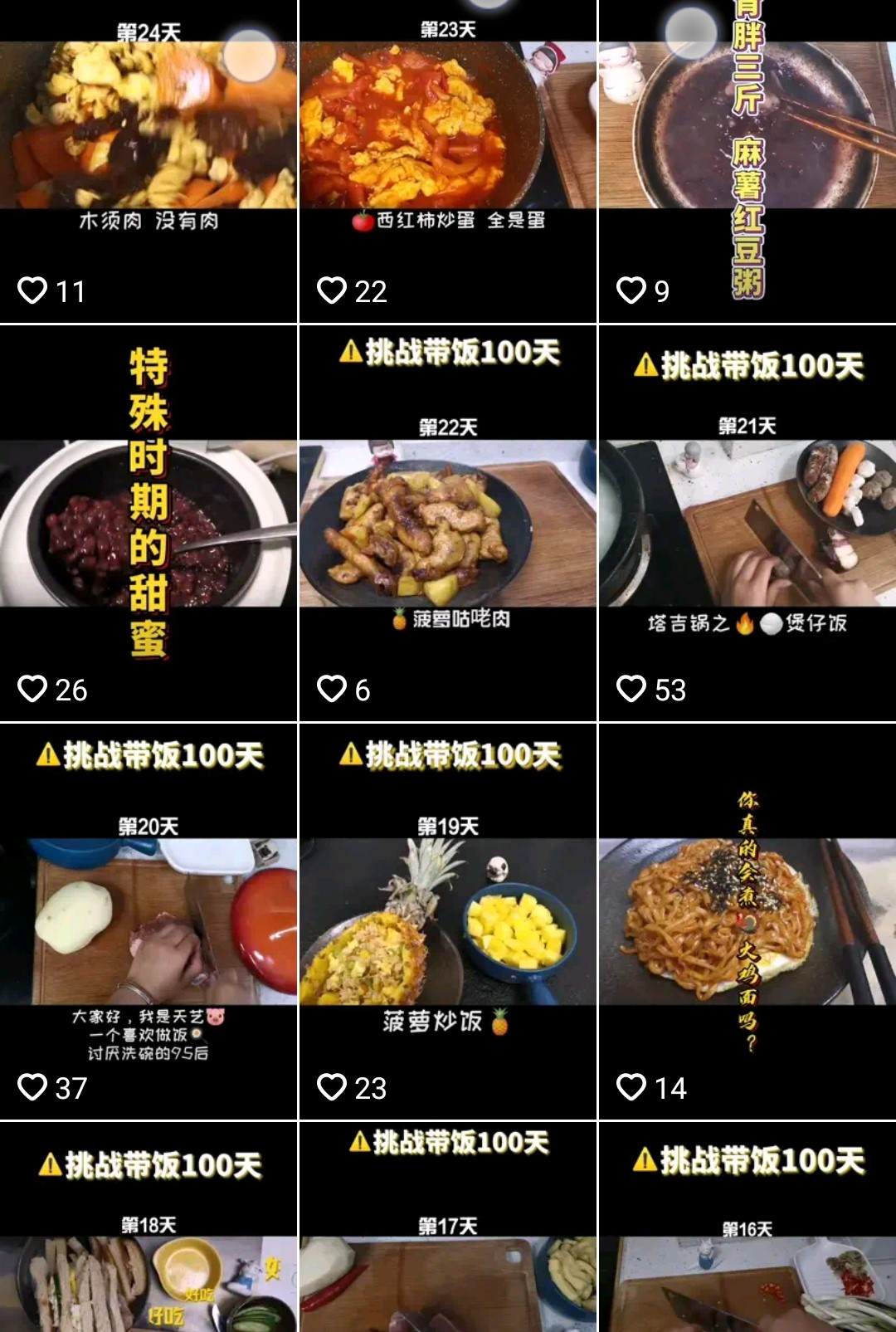 3月22日,她发布了第一条带饭挑战视频,视频中,她给自己做了第一顿简单的盒饭——火锅芋头和红萝卜丝炒肉。