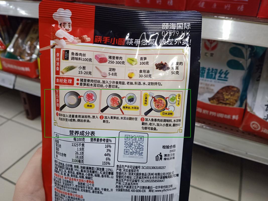 在一袋不到100g的鱼香肉丝包装上,我看到这种调味料在烹饪步骤中画图表示道,只需要三步就可以做出一道鱼香肉丝。包装的右上角写着,“筷手做菜,快过外卖”。