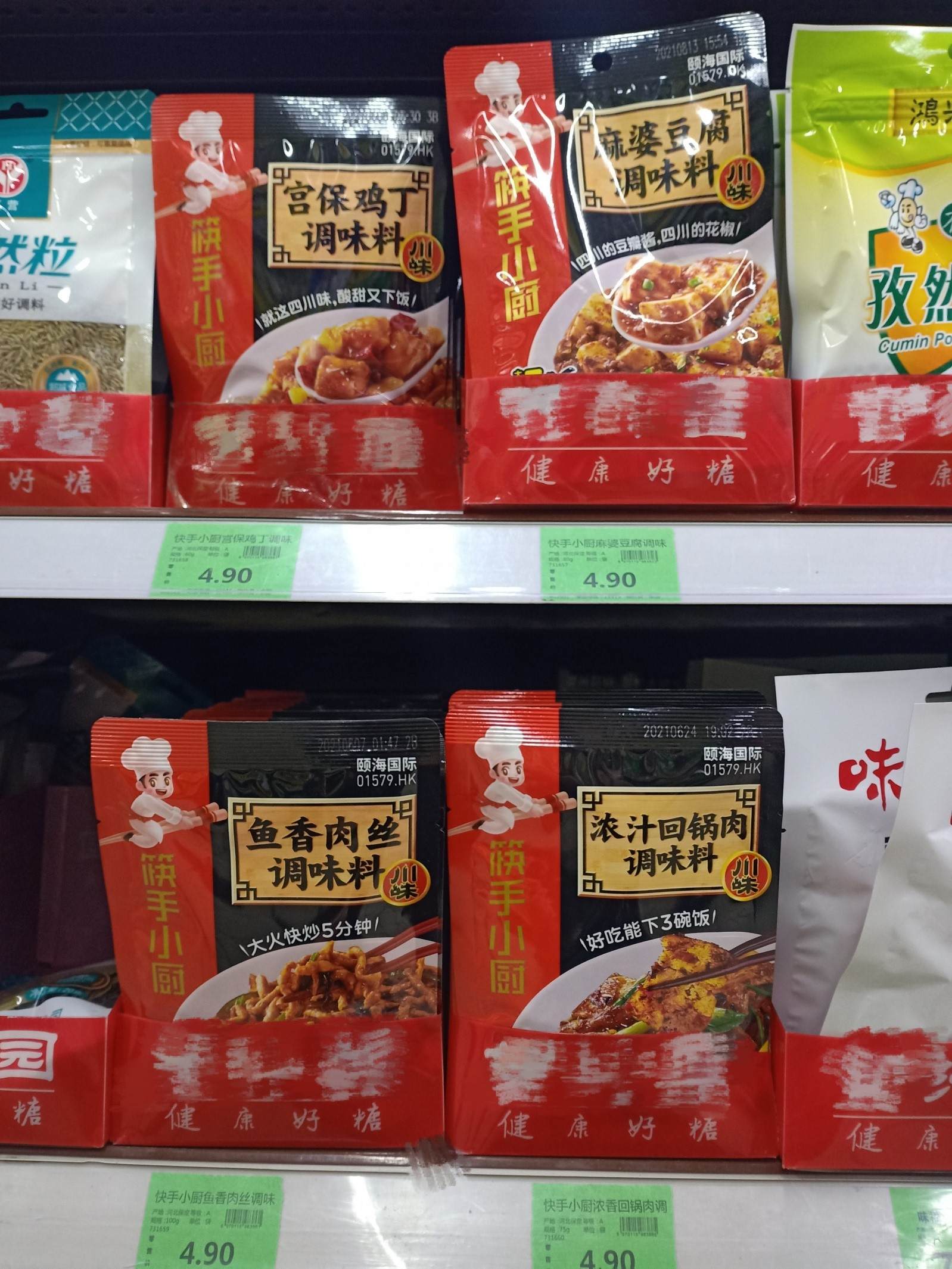 在此次实地走访到的超市中,我们在货架上确实看到了颐海国际推出的新兴复合调味料。主要还是一些经典菜肴,比如麻婆豆腐、宫保鸡丁、鱼香肉丝等。