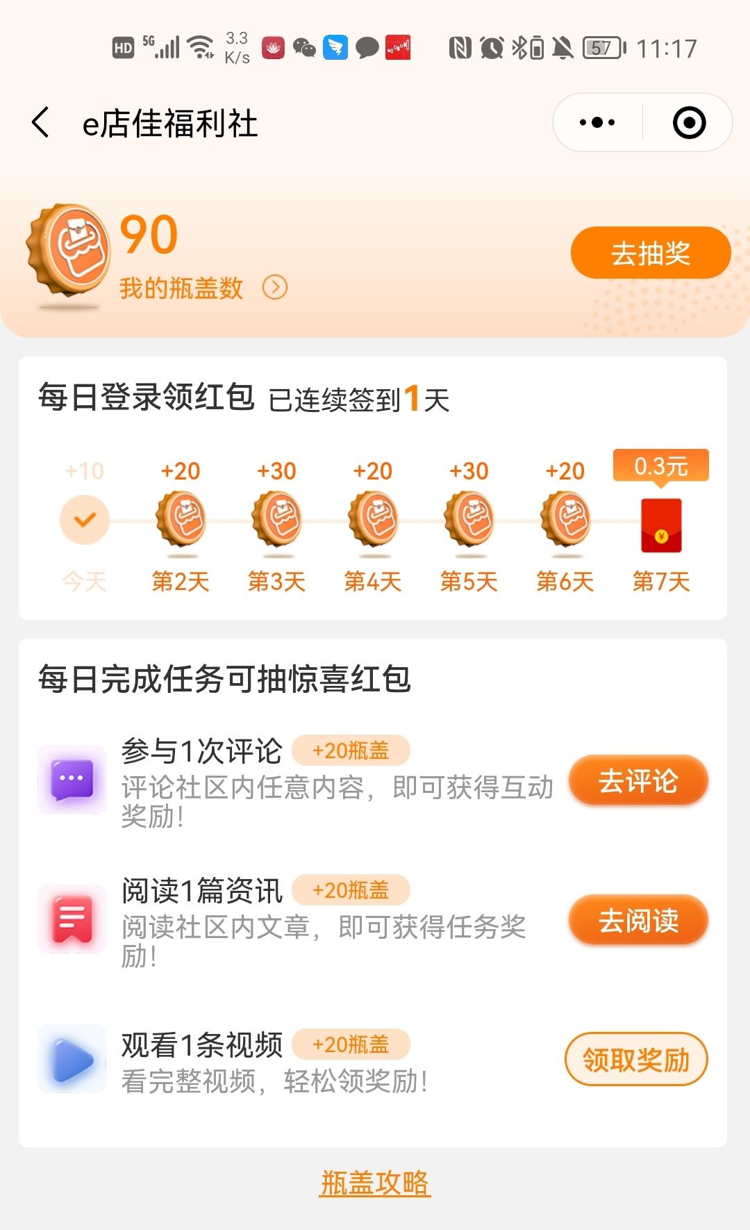同时,“社区”版块与e店佳平台“福利社”版块打通,店主在“社区”版块看指定视频、发表评论会得到相应的“瓶盖”(e店佳平台奖励凭证),积累到一定数量可参与线上抽奖,领取现金红包,从而激发用户参与活动的积极性,提高品牌营销消息的曝光率。