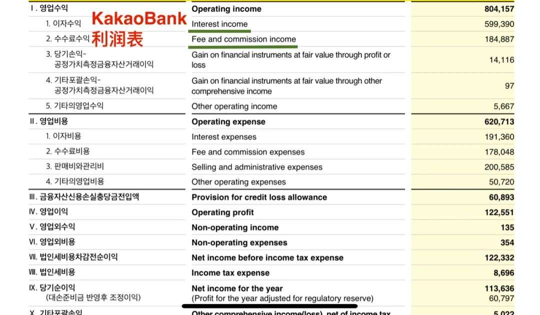 据Kakao Bank公布的财务数据,其营收结构的绝对支柱是利息收入,其次是佣金与交易费收入,这其实和传统银行的盈利模式差别并不大,而它作为一家纯互联网银行,主要优势在于大数据背后的风控以及用户获取能力。财务上看,目前Kakao Bank是盈利的,基本处于“微利”状态。