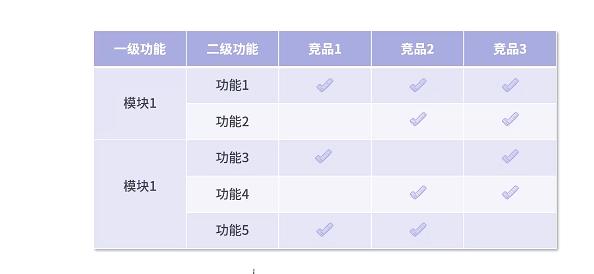 比较法是最常见的,通过罗列每个产品下的功能树图。对比一级功能、二级功能,参考竞品是否存在有。