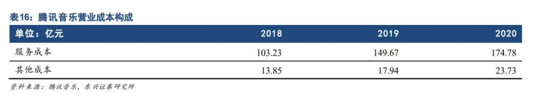 从2018年—2020年,腾讯音乐公司服务成本分别为103.23亿元、149.67亿元和174.78亿元。而服务成本主要为向音乐唱片等机构支付的版税,以及在在线卡拉OK和直播平台上与公会或表演者的收入分成。