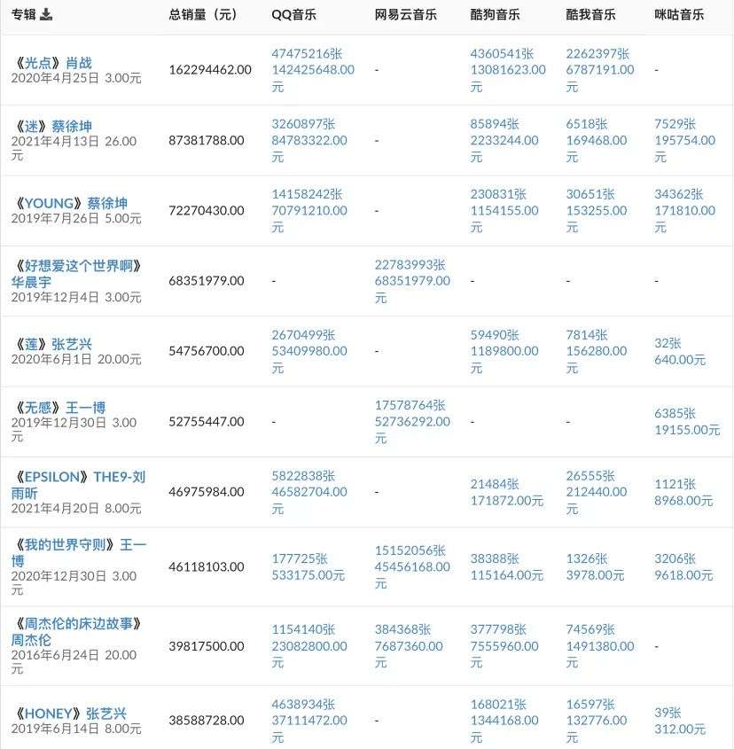 显然随着艺人影响力的改变,由专辑所获得的收入也在变化。但光看最初的7090万元,数字专辑版权费用可谓骇人。
