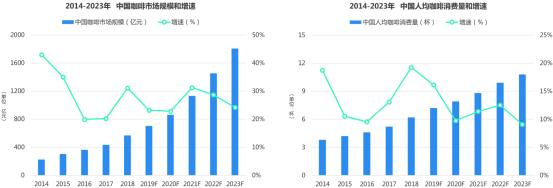 中国咖啡消费习惯尚在培育之中,未来将在咖啡门店更多覆盖的趋势下,就像曾经的奶茶一样,当遍地可以买到现制奶茶的时候,就很少有人喝香飘飘了。预计2023年中国人均咖啡消费超过10杯。