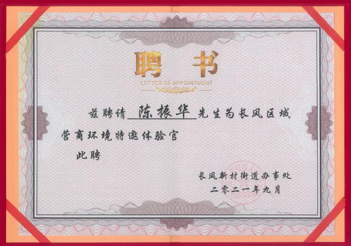 再惠CTO陈振华受邀出席,并获颁聘书,成为了长风新村街道新一批营商环境体验官。