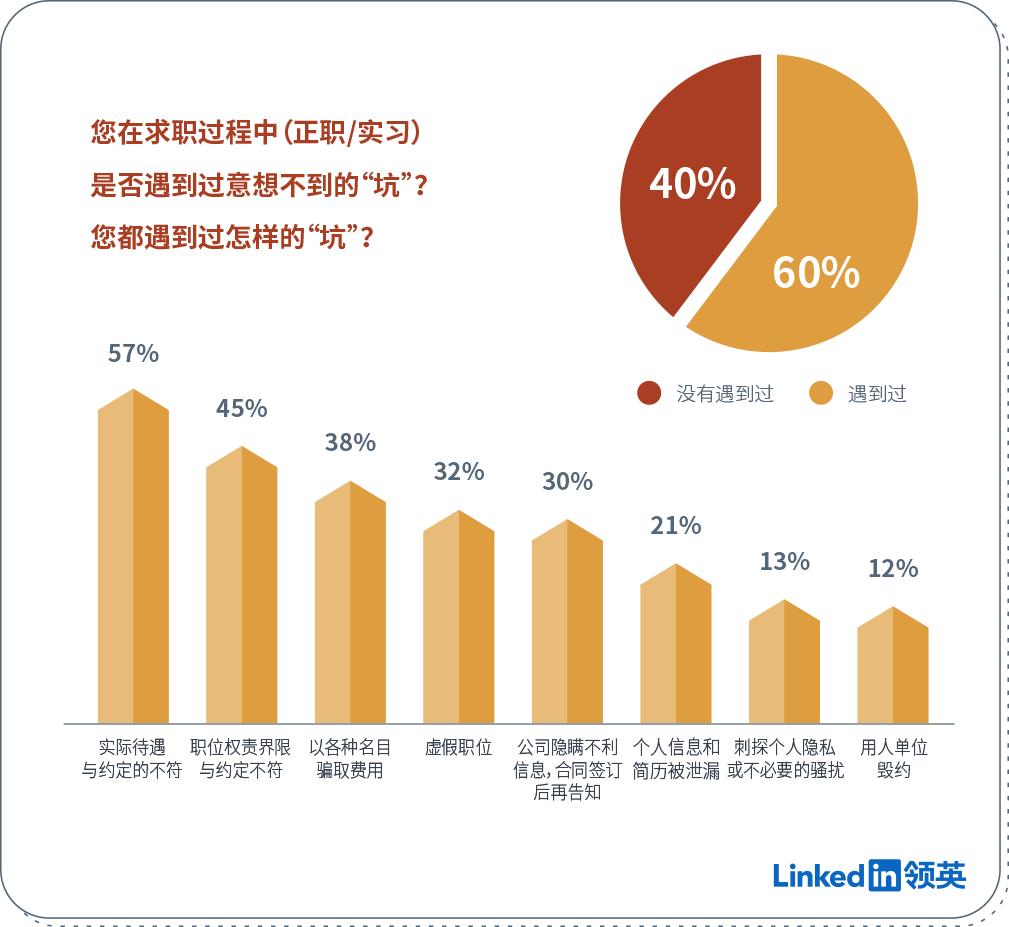 其中最常见的情况是“实际待遇与约定不符”,有超过半数的受访者遇到过,其次是“职位权责与约定不符”和“以各种名目骗取费用”,分别有45.1%和38%的人遇到过。