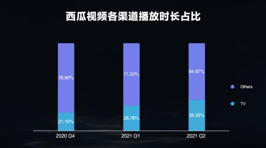 新的中视频概念意在拓展中视频的发展空间,在形式上强调这是一种常见的视频形态,在播放设备上突破手机的局限,将中视频内容引入到其它播放设备上,如智能电视。根据西瓜视频公布的数据显示,主打中视频内容的西瓜视频在近几个季度中,在电视端的播放时长占比在不断增长,2021年第二季度占比达到35.33%,用电视看中视频越来越流行。