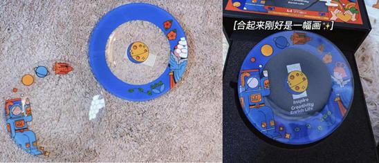 礼盒中还配有两枚玻璃材质的冷盘,叠放在一起是一幅太空人和嫦娥在打招呼的画,细节点满。