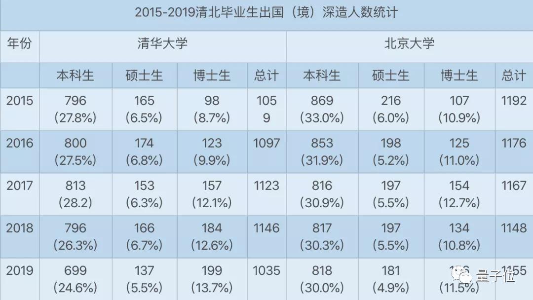 2015-2019年,清华、北大毕业生每年出国(境)深造人数平均为1052人、1168人,在两校毕业生中占比均在16%左右。