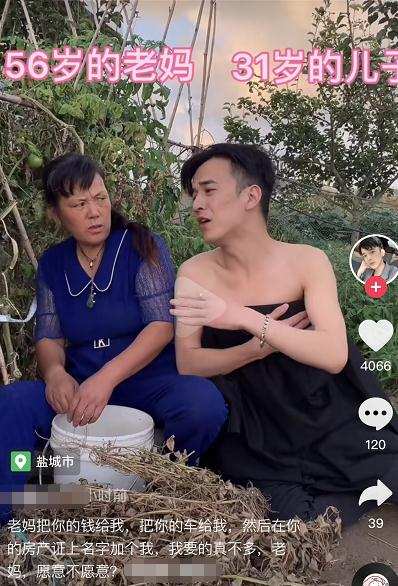 长得眉清目秀,一表人才的男子,却穿着抹胸裙,矫揉造作的向正干农活的母亲撒着娇。