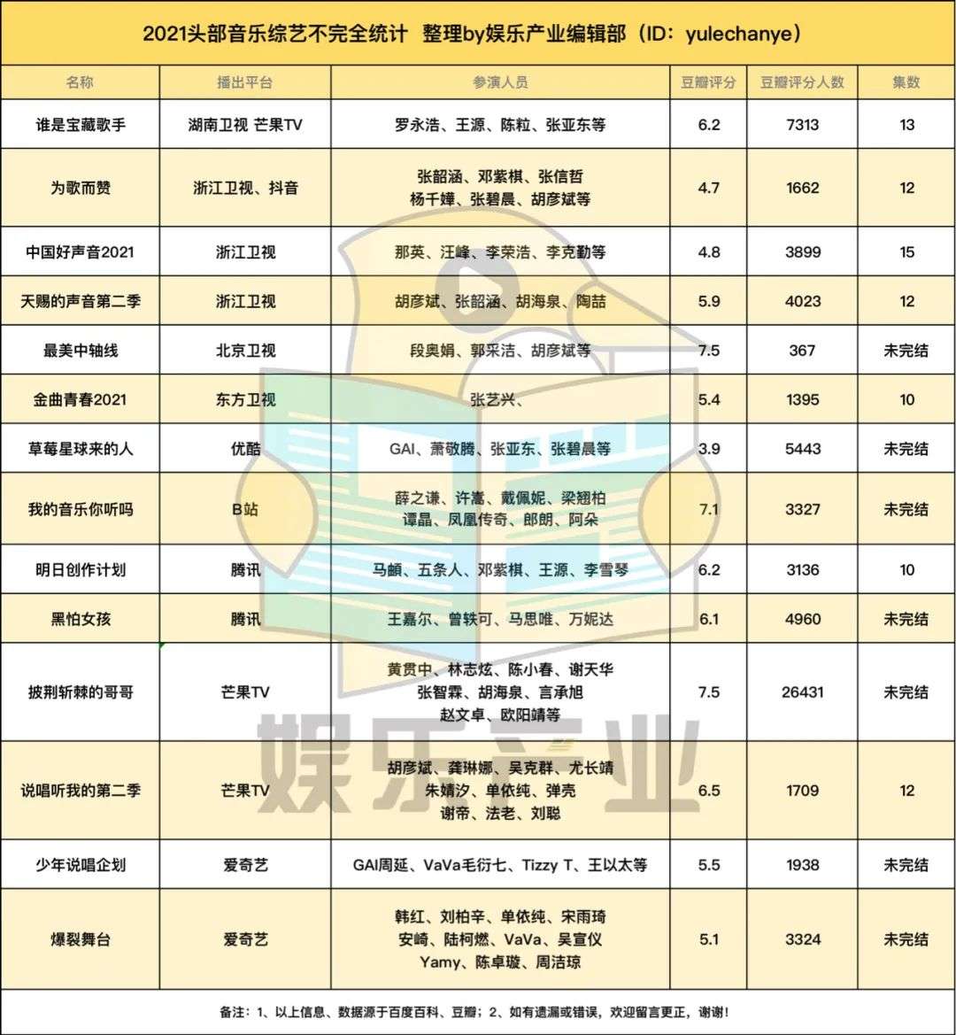 不过,随着越来越多垂类综艺的突围,短视频的崛起,成功抢占用户碎片化时间,音乐综艺的路,变得越来越不好走了。娱乐产业编辑部(ID:yulechanye)整理了今年各家头部音乐综艺,试图洞见这其中发生变化的具体缘由。