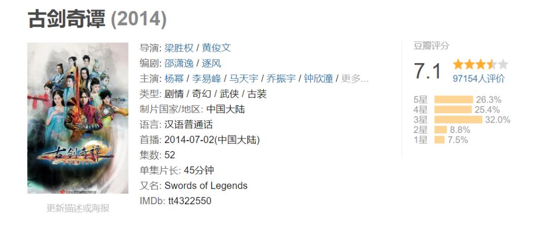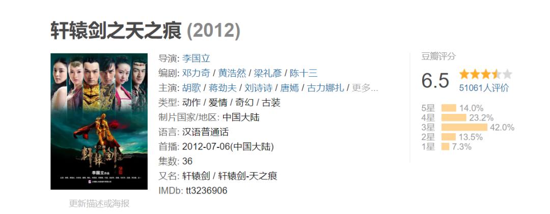 在这一方面受到原作粉丝抵制更多的则是《仙剑三》导演李国立在2012年播出的作品《轩辕剑之天之痕》,这部电视剧在胡歌、蒋劲夫、刘诗诗、唐嫣等明星粉丝大量给满分的情况,仍“收获”了豆瓣6.5分的成绩,就如上文所说,制作方对原作的改编可以用“再创造”来形容。