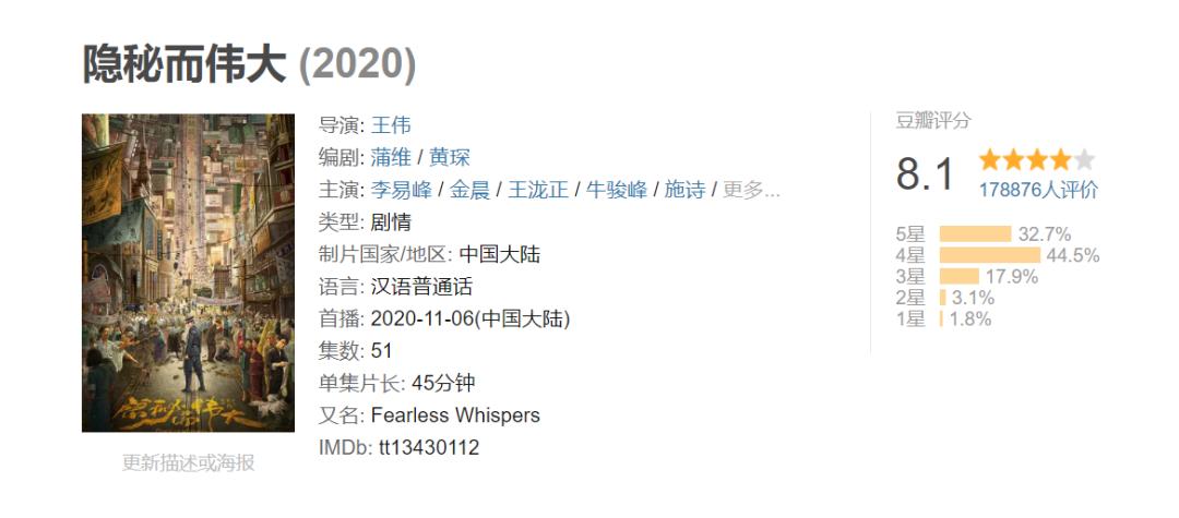 其中三部8分以上的作品《白夜追凶》《隐秘而伟大》《画江湖之不良人》均出自王伟导演之手,而五百导演除了与王伟合作的这部《画江湖》外,其余作品均未上8分,可以说,如果负责《烟火》的导演是王伟,那么作品改编成功的可能性是相对较大的。