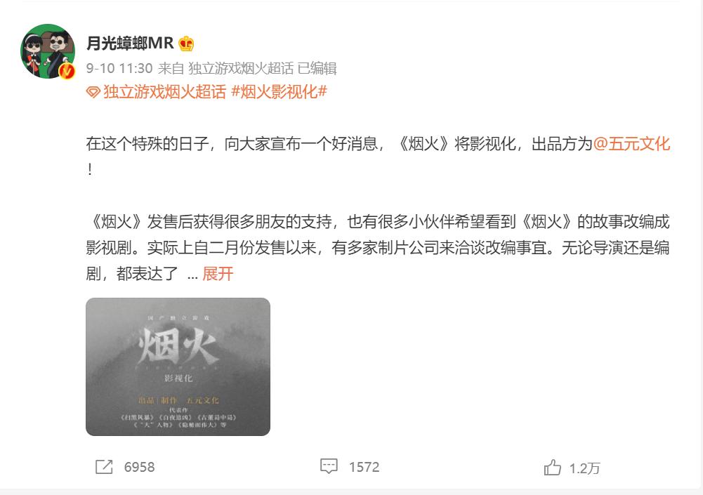 9月10号,在这个特殊的日子里,国产游戏《烟火》的主创月光蟑螂MR与五元文化在上午11时左右同时在微博宣布这款游戏将迎来影视化,这一举引起了多数游戏粉丝的沸腾,截至目前,月光蟑螂的这条微博转发量已接近7000次。