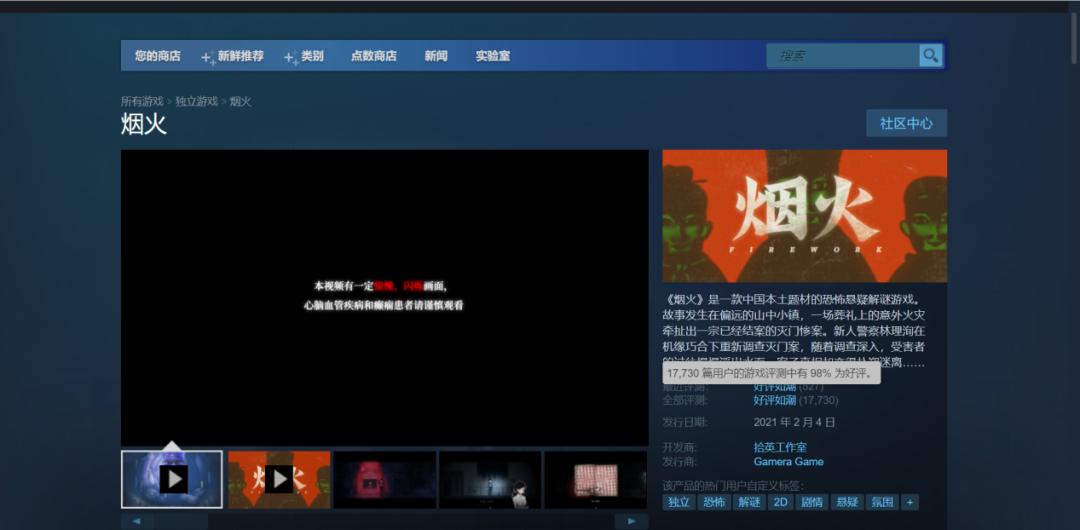 《烟火》是由拾英工作室开发的一款民俗恐怖悬疑解谜游戏,作品发售于今年2月4号,玩家在作品中将扮演新人警察林理洵,借助自己独特的能力,拨开重重迷雾,调查一件发生在偏远山村的灭门惨案,作品因其独特的艺术表达与丰富的内涵在steam上好评如潮,评论数超过1.7万的同时好评率高达98%,是近十年来最无可争议的优秀国产游戏之一。