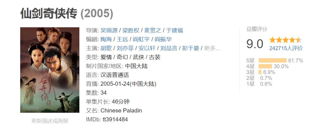 目前,国内游戏影视化最成功的案例是《仙剑奇侠传》这一IP,其先后两部改编作品“仙剑一”和“仙剑三”均在口碑和商业上取得了极为优秀的成绩,前者电视剧在豆瓣上24万评价9.0分,首播创造收视狂潮,单集最高4.6%,单集3.8%;而后者也是在豆瓣上斩获23万评价8.8分的成绩,也获得了极高的收视率。