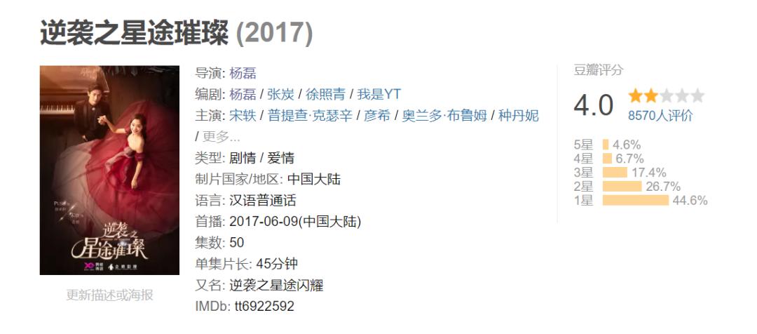 不过,仙侠RPG之外,国内也有着少量其他类型的游戏改编作品,如2017年由杨磊导演的《逆袭之星途璀璨》则改编自“我是YT”制作的娱乐圈恋爱文字游戏《逆袭之星途闪耀》。该导演首播于2014年的电视剧《红色》获得了豆瓣9.1分的高评价,但2017年这部游戏改作品却最终获得了不足《红色》一半的4.0分。该剧由宋轶主演,虽然这位女演员的演技在部分年轻观众中有一定口碑,但她在这部电视剧中的表现就连粉丝都直呼“大跌眼镜”,而作品的编剧也成了观众批评的重点对象之一。