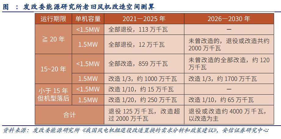 而根据发改委能源研究所测算,预计“十四五”期间全国改造置换机组需求将超过2000万千瓦,需改造机组中1.5MW以下机组和1.5MW机组约各占一半;“十五五”期间风电机组退役改造置换规模约4000万千瓦,以1.5MW机组为主。