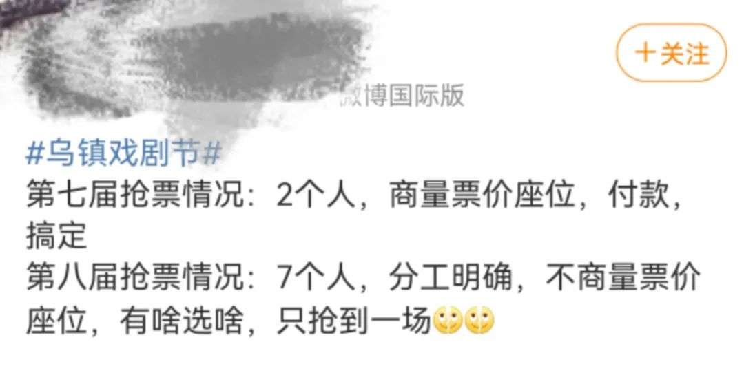 乌镇戏剧节开票后几分钟,在微博、豆瓣、微信朋友圈等社交平台已经能看到各种求票信息。其实在第五届乌镇戏剧节开始,已经开始出现开票“秒空”,但今年的火爆还是出乎很多人已经调高的心理预期。