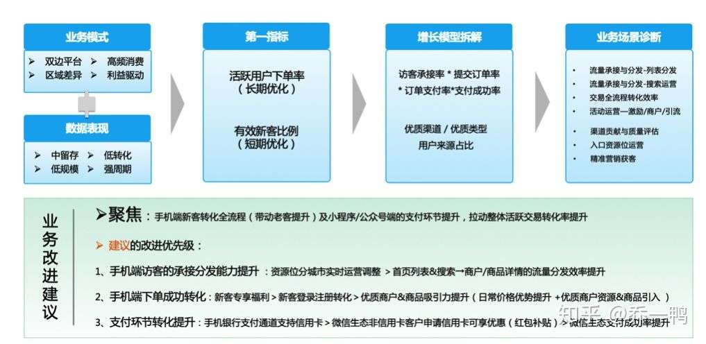 基于这个命题,结合业务线的互联网属性,此次诊断采用了 AARRR 海盗模型作为基本分析框架,进行了基本盘的数据诊断。同时,结合该业务的具体形态和特点,针对各端的核心业务流程以及主要功能场景进行了拆解分析。通过以上专项分析,得出了以下第一指标建议,并根据第一指标的构成,测算了当前业务各个核心环节的增长空间,结合业务诊断提出了对应的提升策略。以下是此次合作诊断的输出的简要小结。