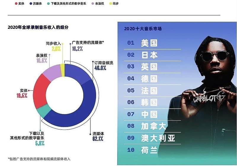 从音乐市场的大环境看,据国际唱片业协会(IFPI)发布的《2020年全球音乐报告》,2020全年,全球录制音乐市场总收入216亿美元,音乐流媒体音乐收入同比增长19.9%至134亿美元,占全球录制音乐总收入的62.1%。但在总体排行榜上,中国只名列第七位,音乐产业开发能力尚与美国等有差距。