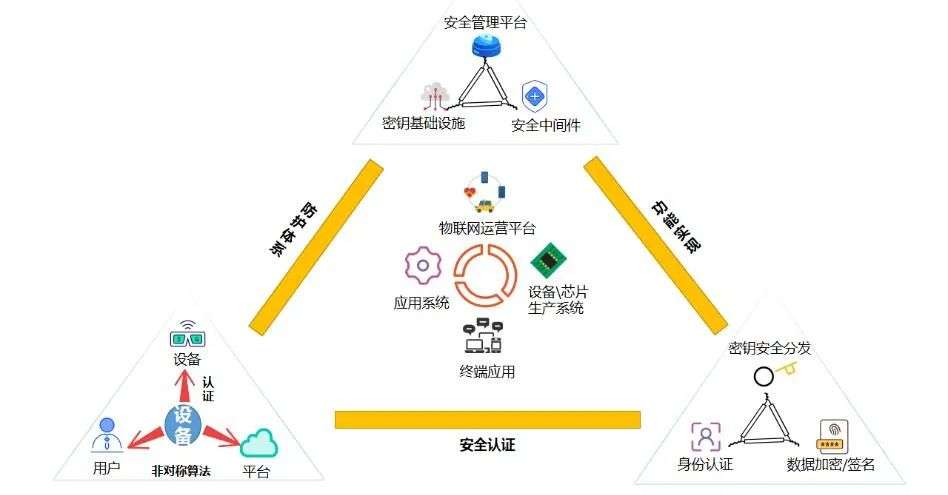 目前许多专业安全厂商提供基于商用密码的物联网安全解决方案,覆盖云管端三个层面,实现密钥安全分发、身份认证、数据加密/签名等安全服务。