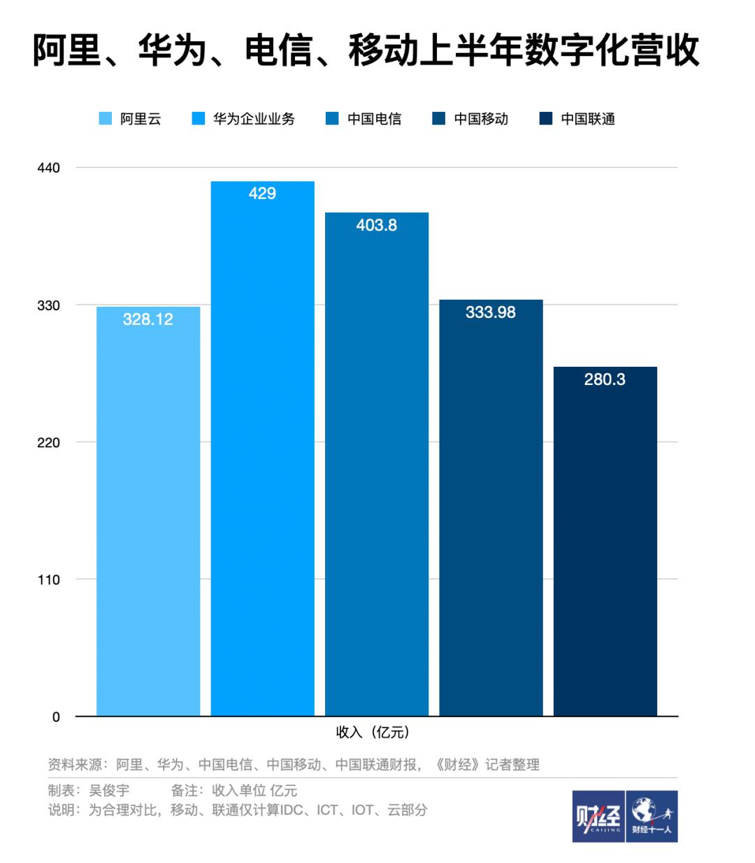 从总营收看,中国电信、中国移动数据甚至超过阿里云。电信运营商和阿里云、华为企业业务在以不同的方式切入数字化市场。