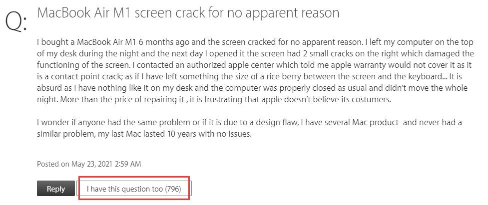 如果苹果所说属实,那为何会有如此多用户都在反映他们的 Mac 屏幕无故破裂?并且按照上文 @xxcherrillxx 的说法,苹果二话不说便愿意“免费修复”,是否意味着这个硬件缺陷对苹果而言是个已知问题?