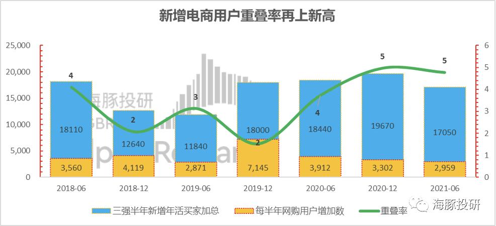 也就是说,上半年1.7亿新增年活买家中,有一亿多的新增其实在对手平台都买过东西,互抢用户和真正新增之间的比例已高达5:1。