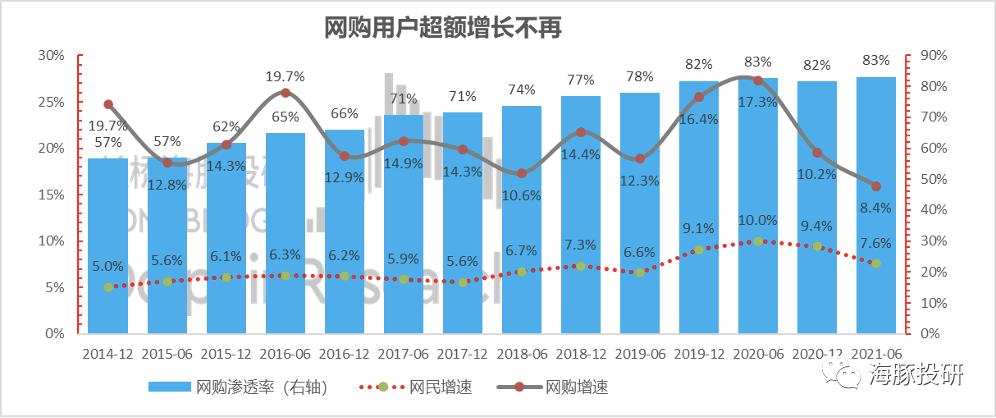 网购用户渗透到顶,二季度电商巨头们用户内卷背后,更多是将精力是通过社区团购放到了长线钓取“用户钱包份额”的铺路上。