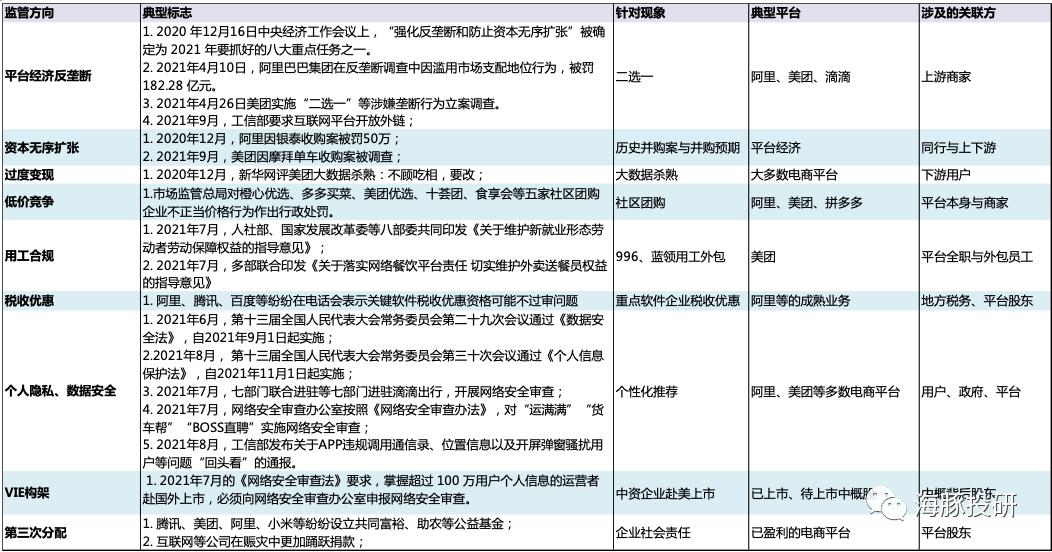(1)平台经济反垄断: 重点整治高市占率又有二选一嫌疑的平台阿里、美团,目前阿里182亿罚款已交,阿里解除商家二选一后,商家自主选择能力变强,对行业竞争格局影响较大。