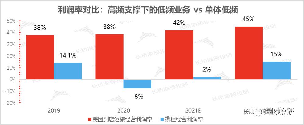 美团用一个100万日活的重履约骑手队伍,把高频的外卖和到店业务做成了具备单体盈利能力的业务,接着用高频打低频模式,场景顺延至本地酒旅,美团酒旅的流量来源于本身能够自我盈利业务的高频到店/到家业务,因此没有流量成本。