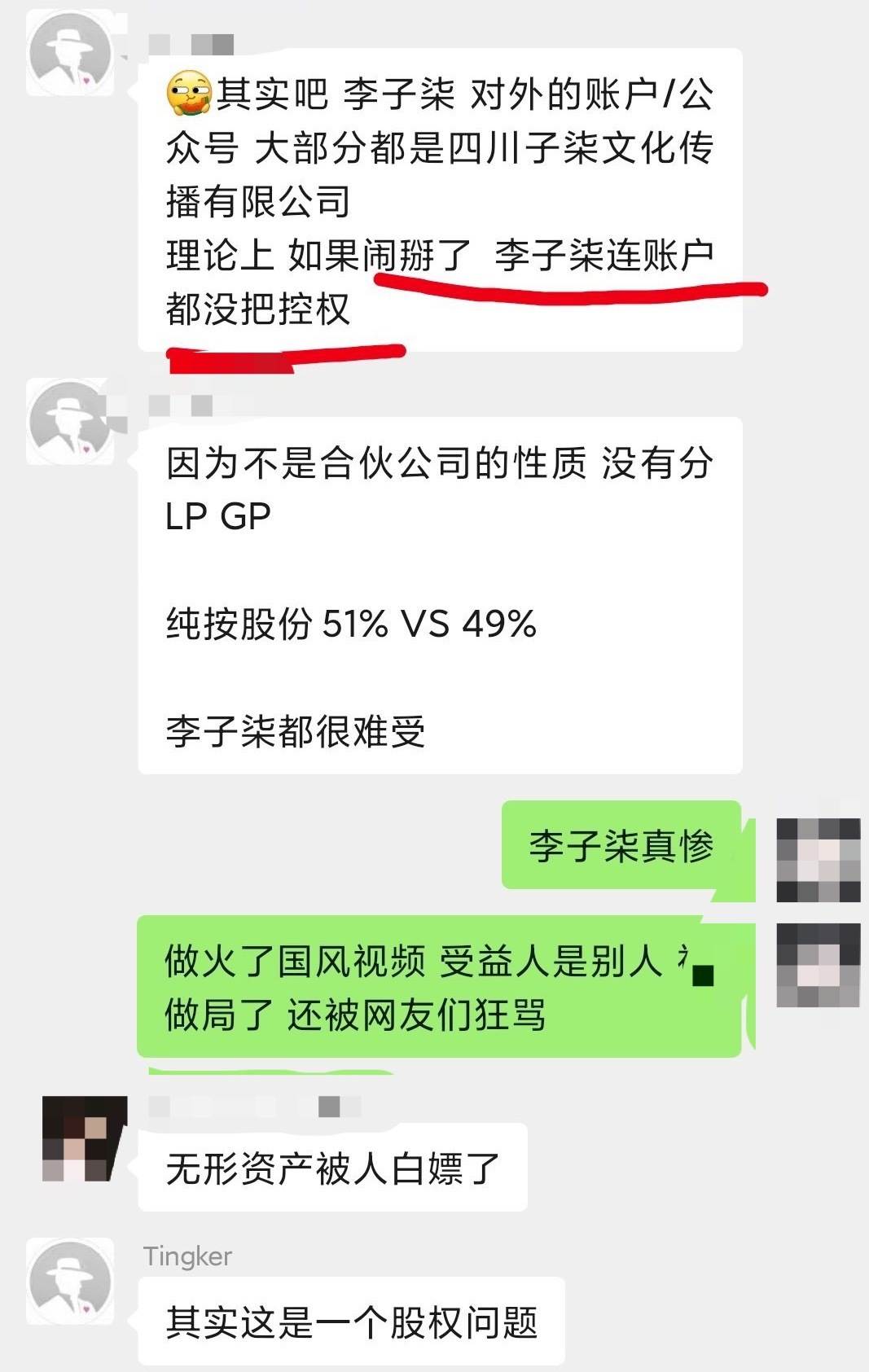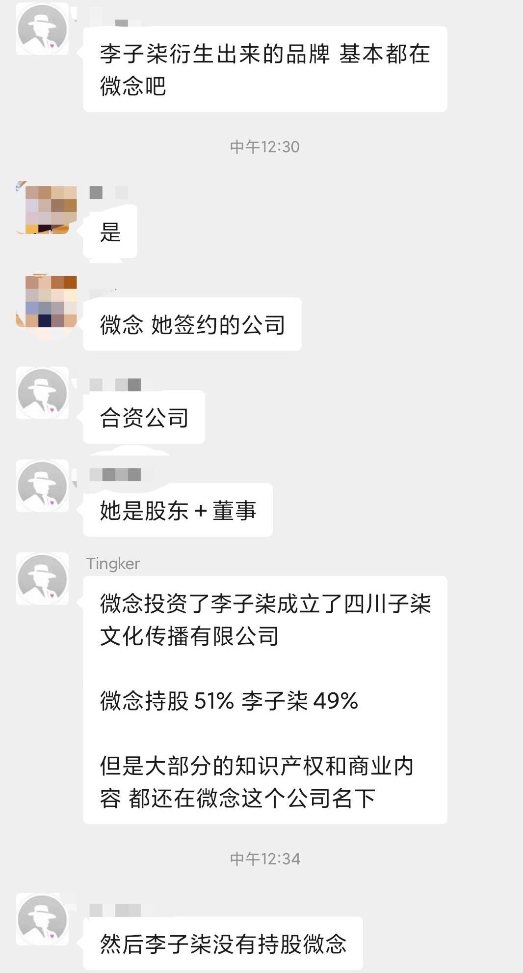 截图还指出,李子柒大部分知识产权和商业内容都在微念公司名下,若她与公司闹掰了,连账户把控权都没有。聊天记录中甚至有人建议,不要在注册资本很大的公司做小股东,另外不要合伙,自己单干最合适。
