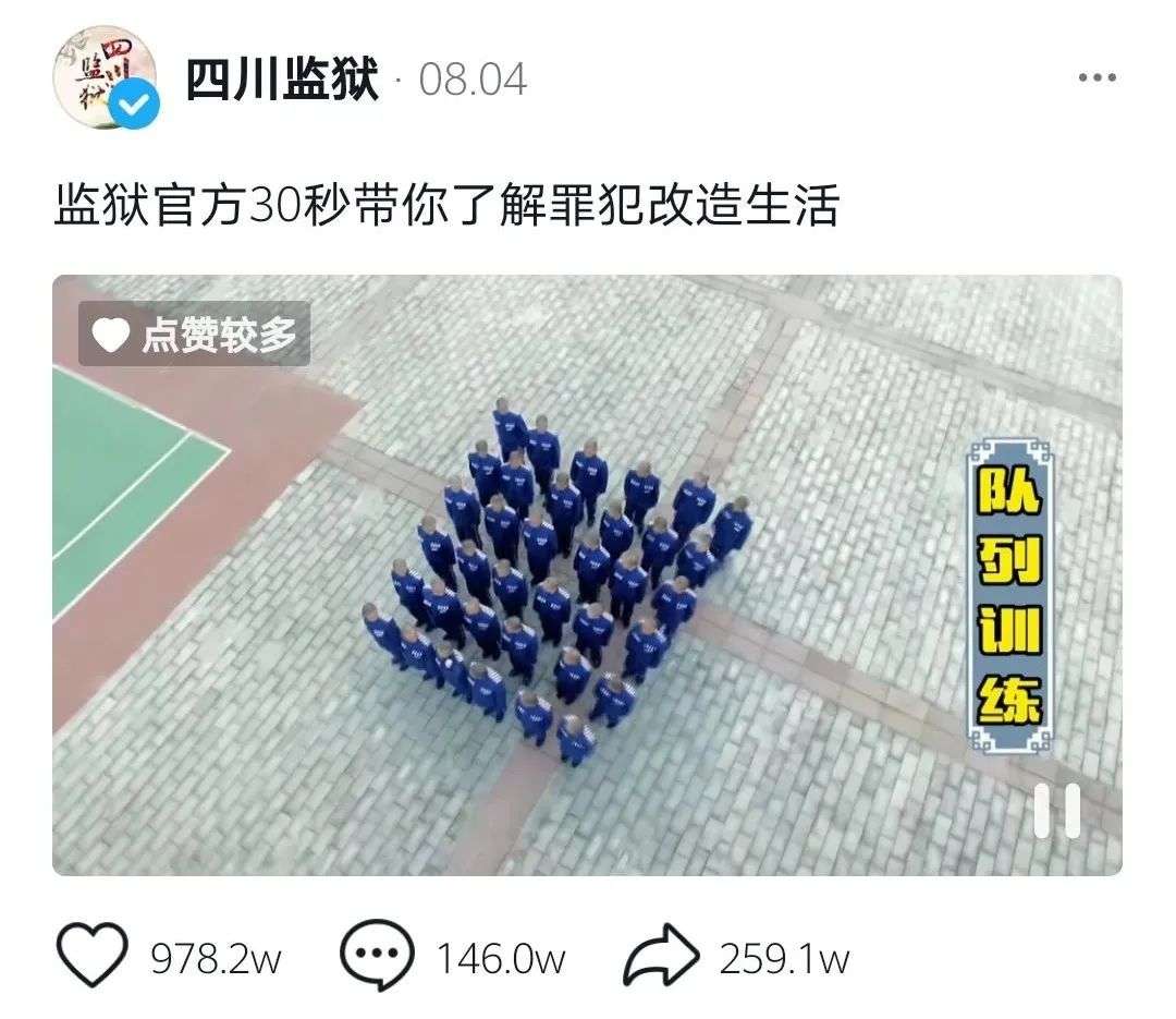 而四川监狱的抖音账号则是利用了事件营销思维,在某明星入狱时发布了一条名为“监狱官方30秒带你了解罪犯改造生活”的vlog视频,累计获得了978.2w的点赞。相较于该账号平时说教意味较浓的讲解视频而言,该视频的数据量级不在一个层面上。