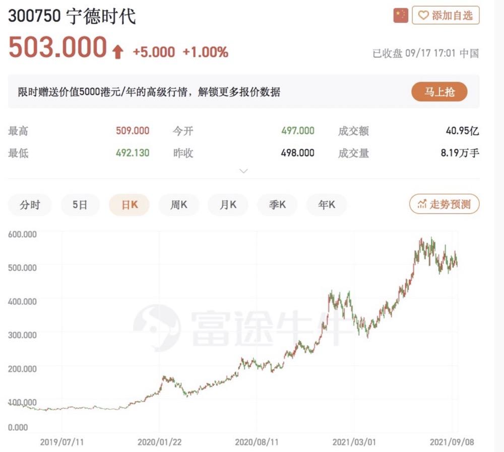 2020年至今,宁德时代股价已上涨近4倍,截止9月17日,宁德时代股价报收于503元,总市值达到1.17万亿元,市盈率超过130倍。