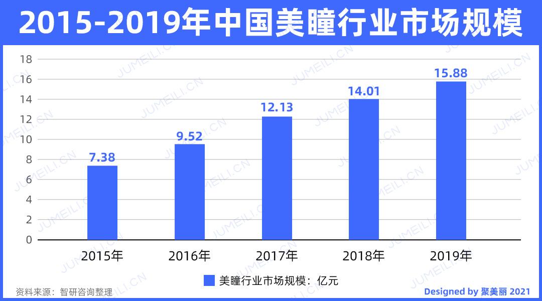 根据《2021-2027年中国美瞳行业发展现状调查及前景战略分析报告》,2015年中国美瞳行业市场规模为7.38亿元,2019年中国美瞳行业市场规模为15.88亿元,年复合增长率为21.12%。Mob研究院预测,2025年,中国美瞳行业市场规模可达500亿元,有望成为全球最重要的市场。