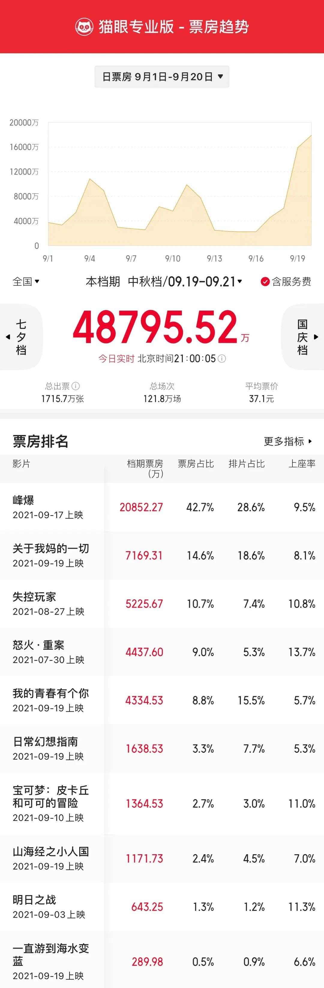 19号,也就是中秋节假期开始的第一天,《峰爆》就已经率先破亿;上映第4天,影片破两亿。在三天假期内,影片票房达到2.08亿+,大盘占比42.7%,后面这个数据其实是近五年的中秋档票房冠军里表现比较好的。