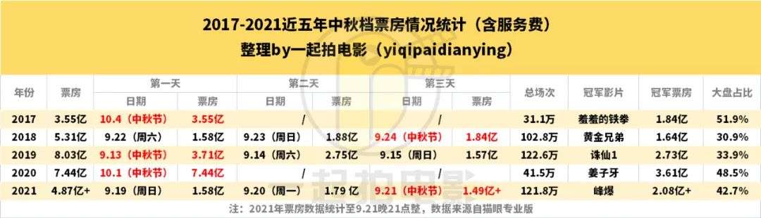 为了更直观展现今年中秋档的成绩,拍sir也纵向比较了从2017-2021近五年间中秋档的票房情况,得到了如下表格。