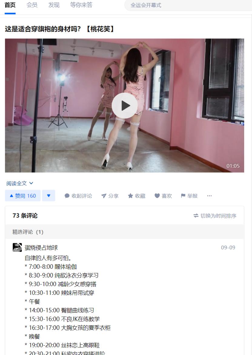 一个有点喜感的现象是在这些吸睛美女视频的评论区里,知乎的用户还形成了“哥又学”、“哥几又”、“哥学搭”(哥几个又来学穿搭/跳舞/瑜伽)、“自律的人有多可怕”等复制粘贴的评论体:
