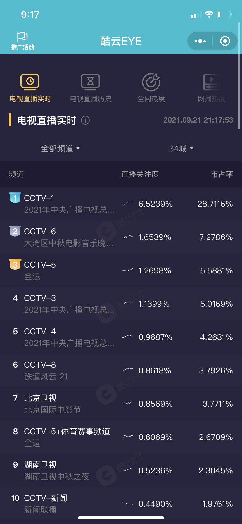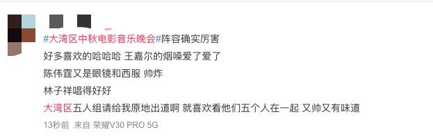 截止晚9:20,央卫视、视频网站共计6台晚会播出,将合家欢的氛围烘托到了极致,微博热搜娱乐榜下的明星话题几乎被中秋节和秋晚所抢占:#范丞丞中秋晚会开始和结束都在#、#大湾区中秋电影音乐晚会#、#中秋节目单#等越来越多的相关话题爬上话题榜前列。