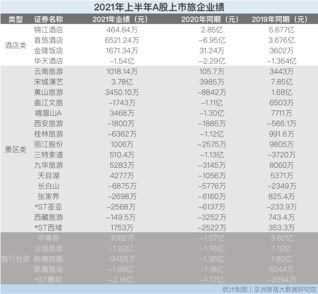 据亚洲旅宿大数据研究院统计,2021上半年的25家A股上市旅企业绩中,有12家实现扭亏。虽只有*ST西域和三特索道两家旅企实现了扭亏同时赶超2019年的数据,但也不难看出,旅企们正在持续复苏、走出阴霾。