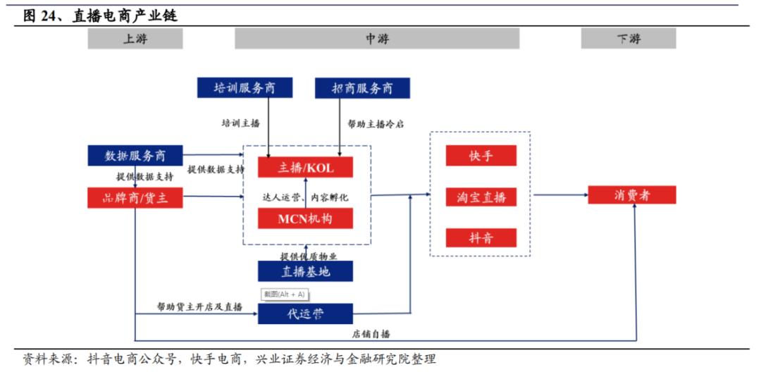 直播电商产业链主要包括 5 类参与者:品牌方/商家、主播、MCN 机构、平台、服务商。商家通过MCN机构寻求符合其带货诉求及品牌调性的主播进行商业投放,获取品宣及销售收益。MCN机构负责孵化主播,帮助商家与主播进行对接,根据主播达人的粉丝体量从几千至十几万不等坑位费中收取提成。平台则具备供应链及流量优势,直播电商产业链中收益方式主要来源于直播方投流费用。
