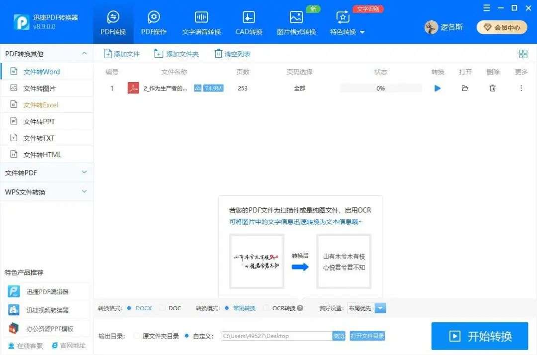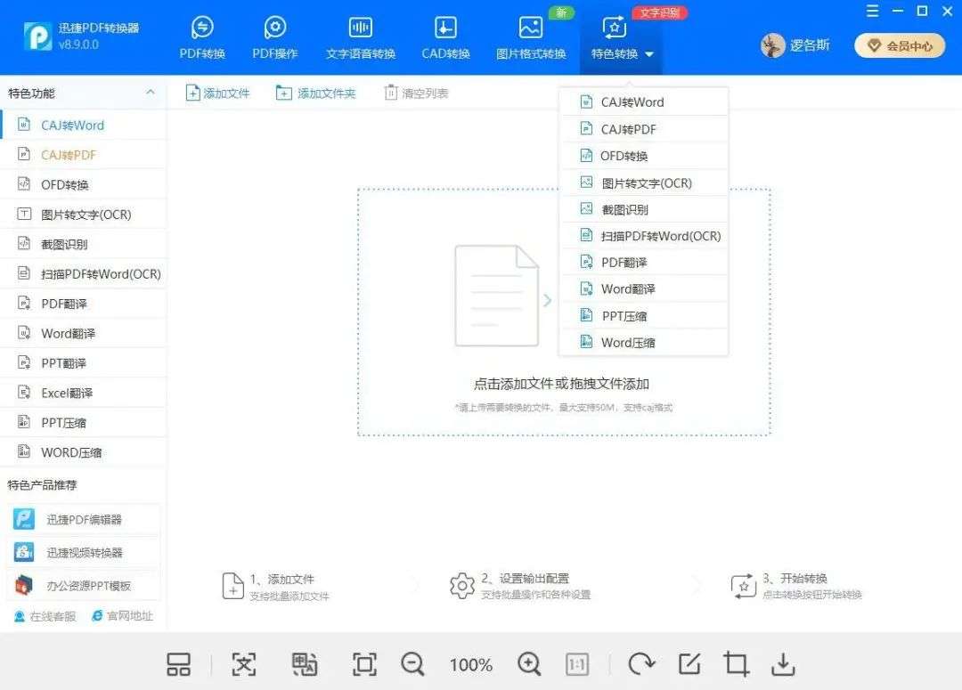 每次打开《迅捷 PDF 转换器》A 君都会种被「转晕了」 的感觉,因为除了名字提到的 PDF 与各种格式文件的转换,其还能进行 PDF 编辑、语音文字互转、CAD(一种常用的设计文件)转换、长图制作、OCR 文字识别、文本翻译等多种操作。