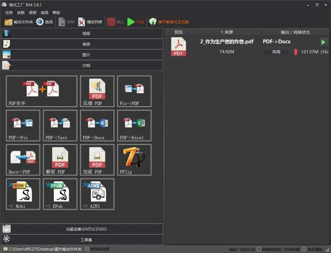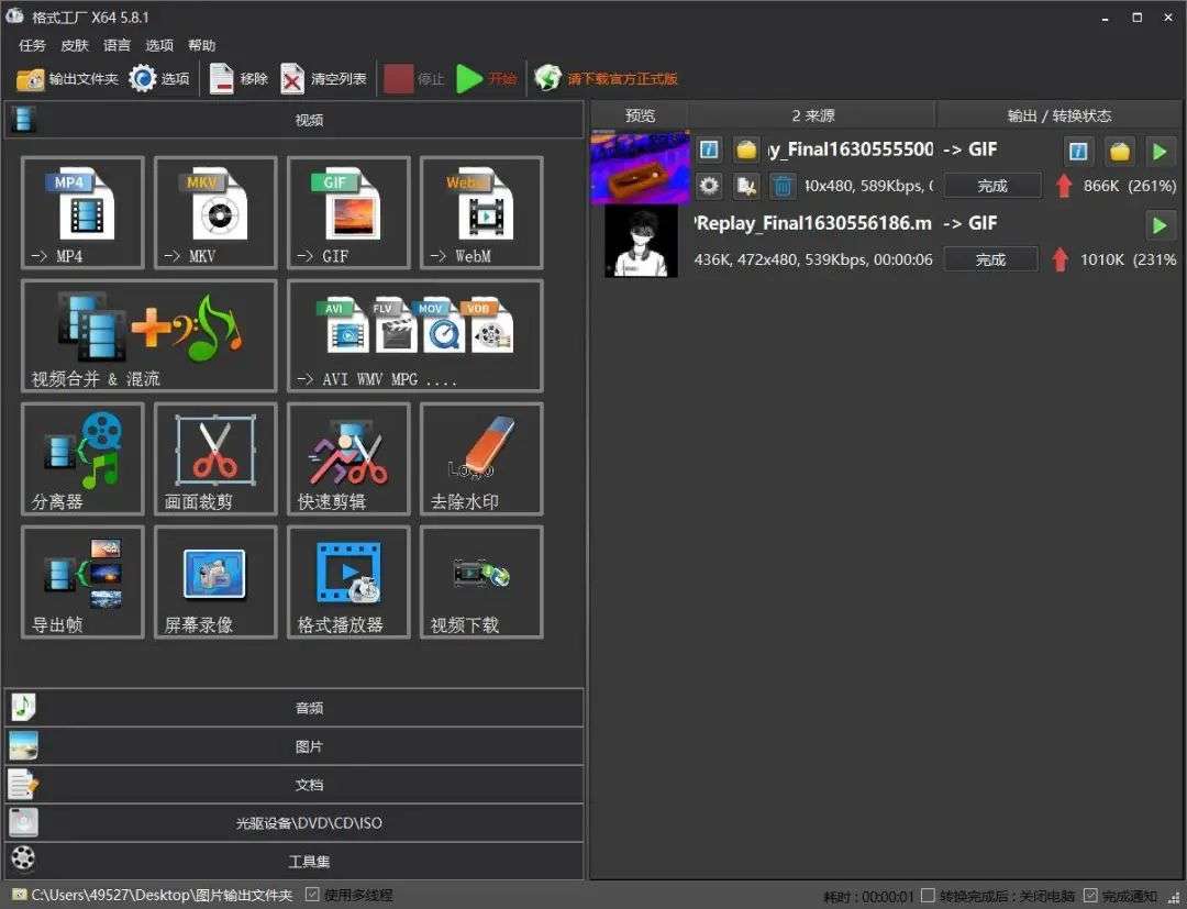 在《格式工厂》中不同类型的转换工程可以一并进行,还能在右下角勾选转换完成后自动关闭电脑,的确有工厂作业的感觉。以下是两个从 iPad 端录屏,再将视频文件导入《格式工厂》进行制作的动图。