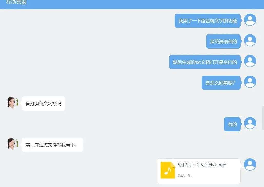 在测试录音转文字功能的时候,A 君发现自己的软件似乎不能使用英语录音转文字,遇事不决找客服!客服也不负所望很快发来了转换好的文本,并告知可以尝试一下迅捷的网页版。