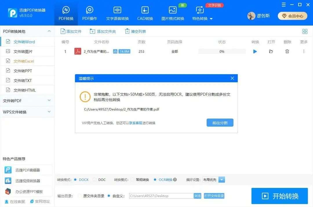 其实这款软件最让人惊喜的还在于它友好的人工服务。本想把一个 75 M 的全图 PDF 文件丢进软件进行 OCR 转换,软件却提示说不能一次过处理 50 M 以上的文件,要首先进行分割处理。