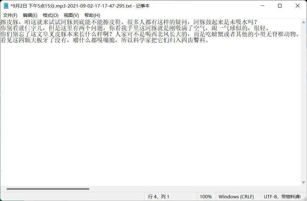 随便用手机录了一段 B 站 UP 主科普河豚的讲解旁白来测试,效果还不错,只可惜 txt 格式本身没有什么排版可言,如果是长的对话还是得手动调整。