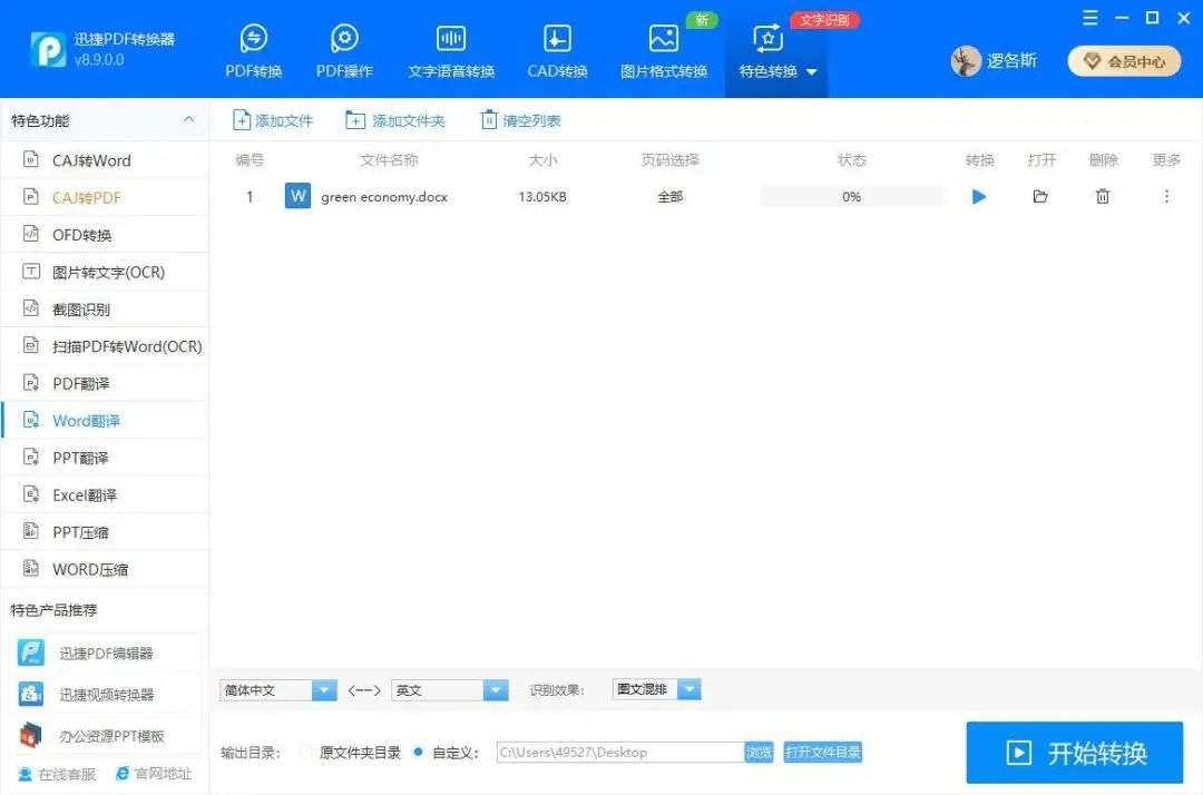 要使用 Word 文本翻译首先得选择「特色转换」 中的 Word 翻译一项,然后把一篇外语的 Word 文档拖动到软件中。在下方语言选项中选择文本对应的原始语言和目的语言,再根据 Word 文档中是否有图片而决定是否勾选图文混排即可。